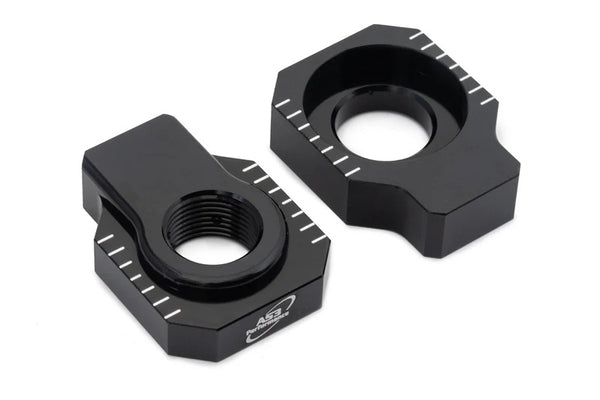 AS3 Performance rear axle blocks are CNC machined from billet aluminum for the perfect fit in the swing arm and around the rear wheel spindle. The alignment scales on the top and bottom of each block are designed to help correctly position the rear wheel. They have a smooth anodized finish and feature AS3 Performance branding on the back of both blocks.